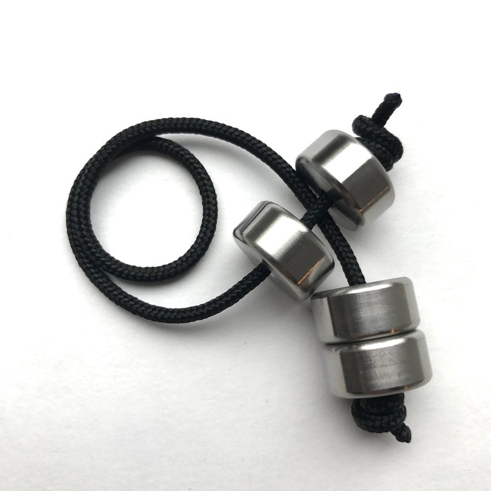 The titanium version comes with four beads, precision-machined from grade 5 titanium, weighing in at around 7g per bead, for a total of around 28g per set. The beads themselves are 16mm in diameter and 8mm thick, making for a 16x16mm stack at either end.