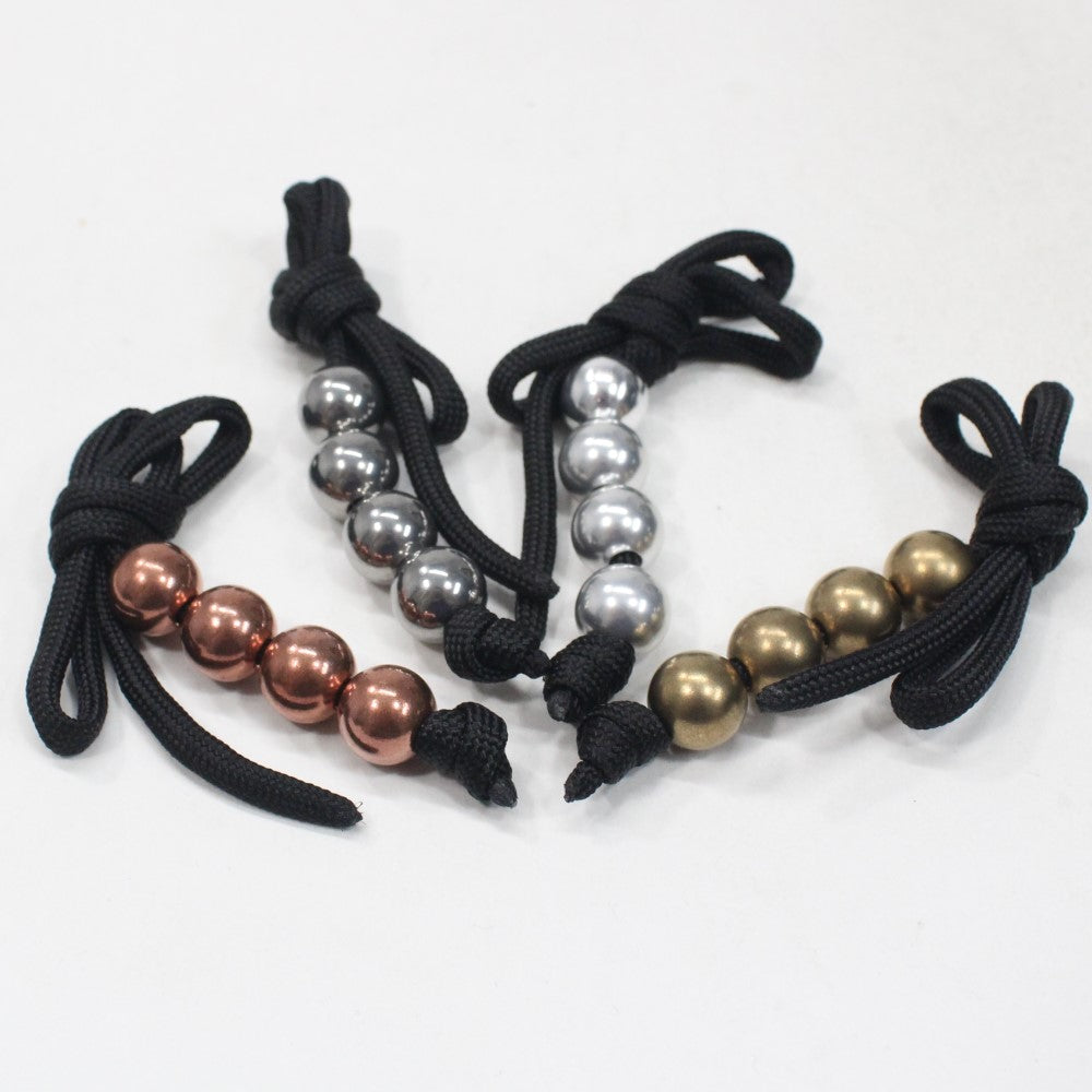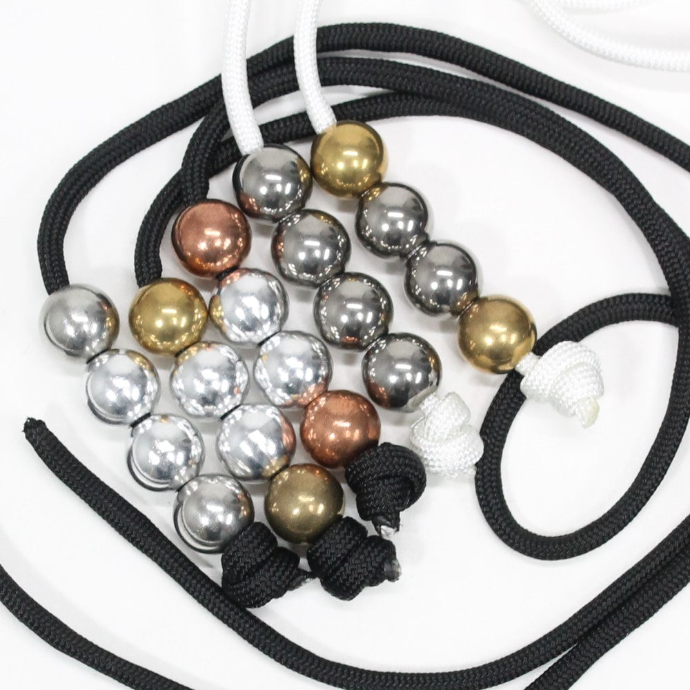 Aroundsquare's Micro Boss begleri series is a "back to the roots" design that resembles traditional Greek begleri more than anything else we have produced to date. The pairs of small spherical beads are a throwback to the worry beads of an earlier era, before players started getting too technical. The multi-bead design, with the bottom-heavy metal pairings makes these sets soft and springy to play, with great overall weighting. These sets feel heavier than the specified weight due to the bottom weighting of the design.