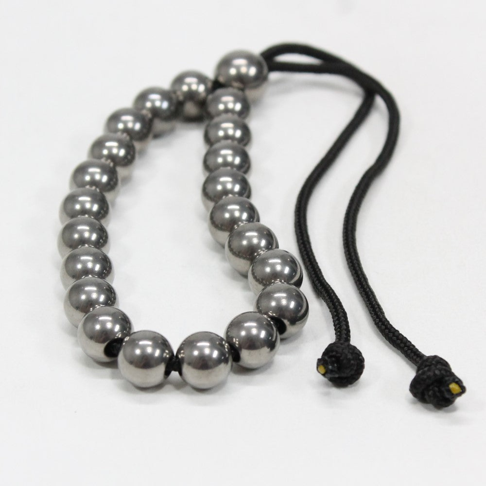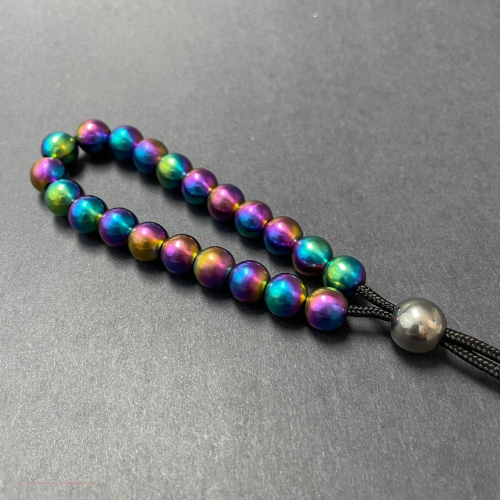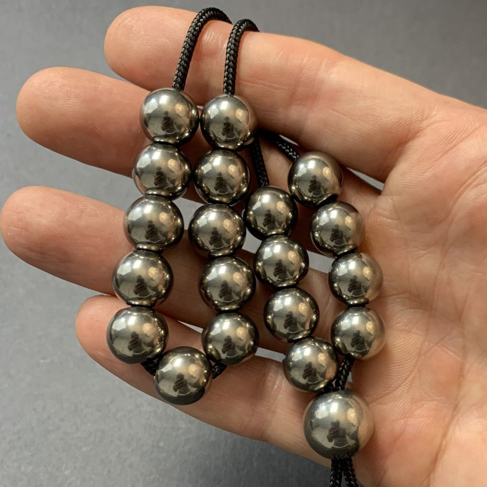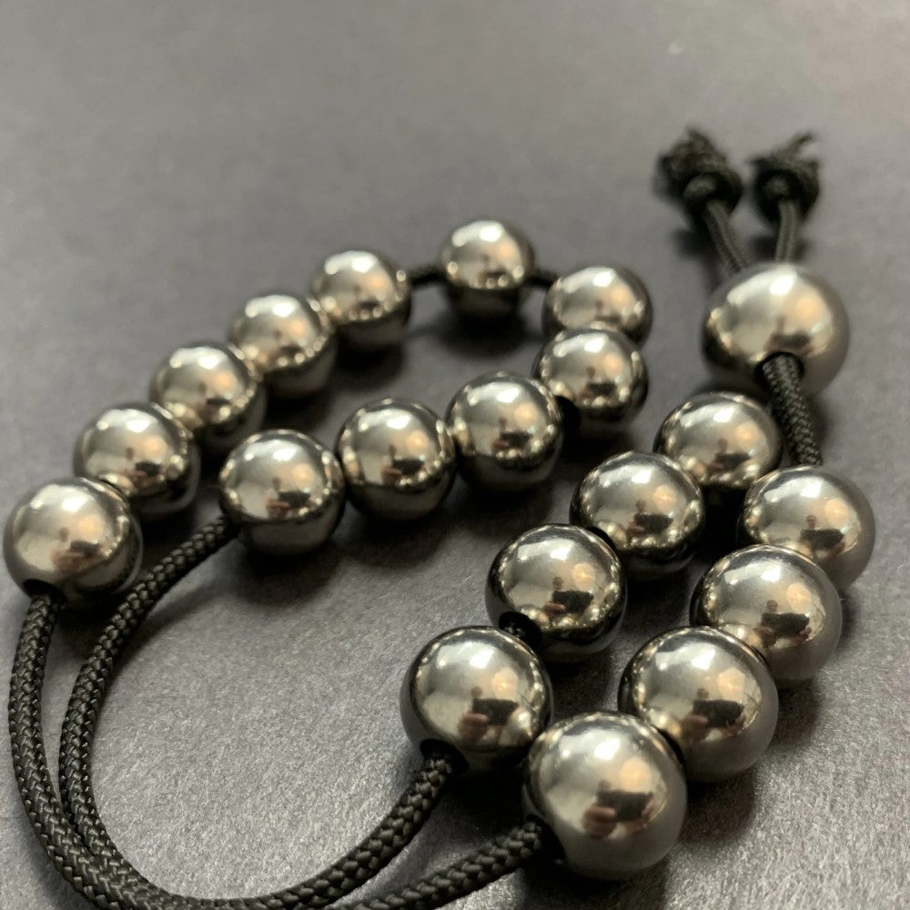 The MKUltras 10mm Edition consists of 21x 10mm beads, with a 11.8mm Micro Boss bead to close/ adjust the loop. Though less than 2mm smaller in diameter than the beads of the original Ultras, the beads on the 10mm Edition feel substantially smaller on the wrist, in the pocket, and in the hand. The smaller sized beads are lighter, making them easier to flip in the manner of begleri, while the round shape makes them easy to grab individually for bead counting and breath work.