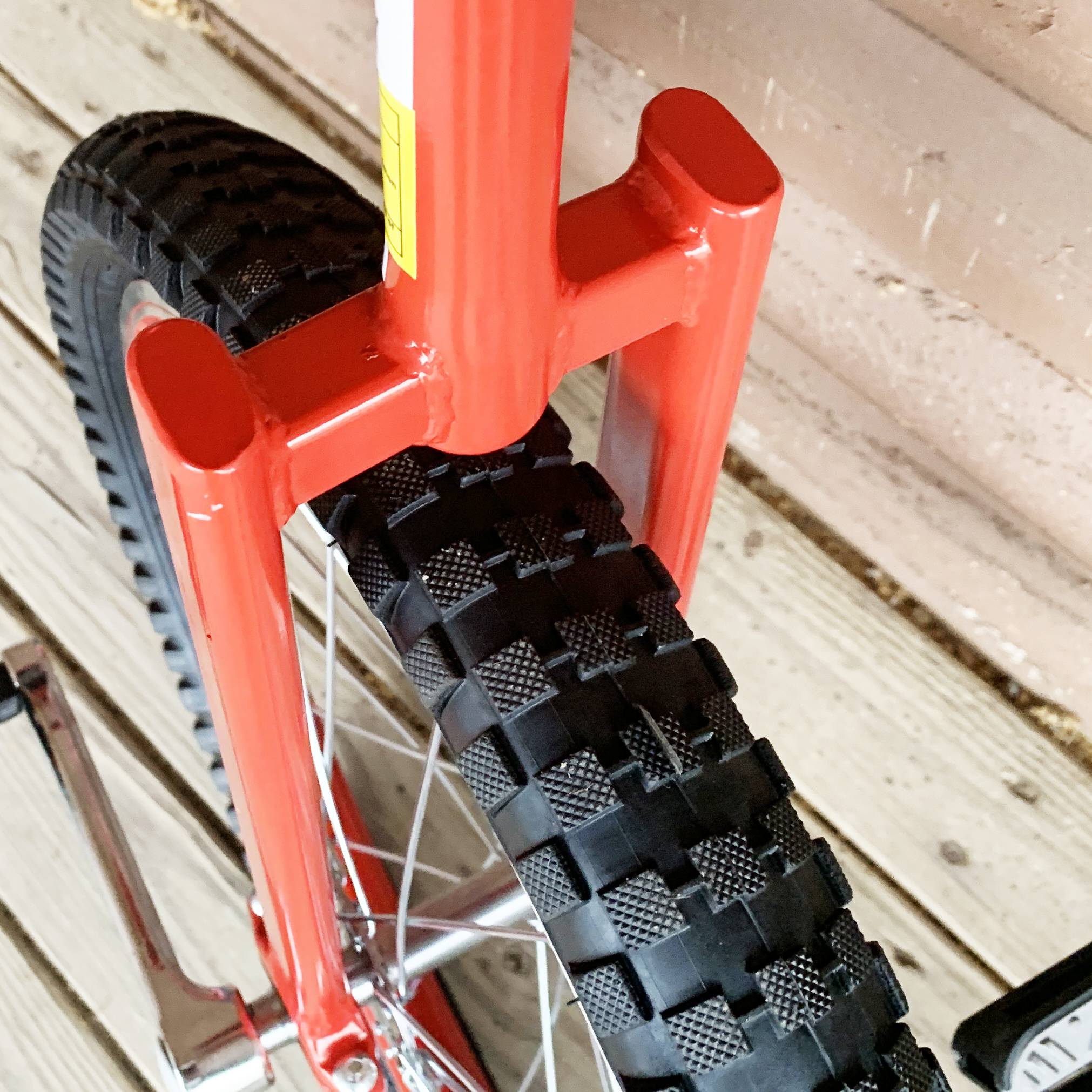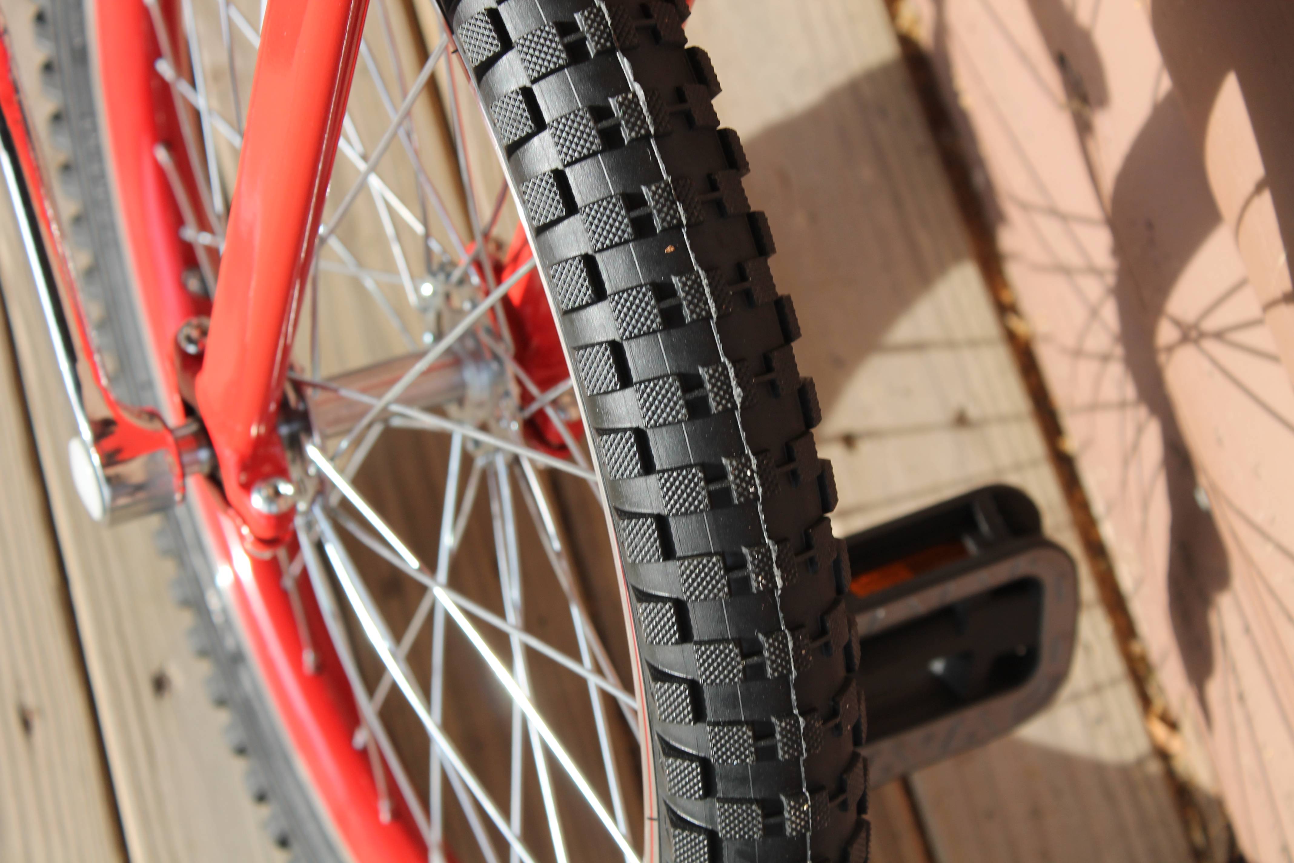 Wheel: A wide 2.4" all terrain tread, reinforced double walled aluminum rim, rubber tube, stainless spokes