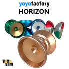 YoYoFactory has had the pleasure of working with Mexican Champion Paul Kerbel and reimagining his classic YoYo "HORIZON" has been one of the most fun projects we have been involved in. Paul is a wizard and his needs and desires in a YoYo have always been a little off typical which again leads to a spectacular result. HORIZON is the yo-yo you will want to carry at all times. Wide enough for everything, powerful enough for anything. Pleasant float like a capped yo-yo that typically compromises performance for this aesthetic and fingerspin like a PRO with the exceptional capped design.