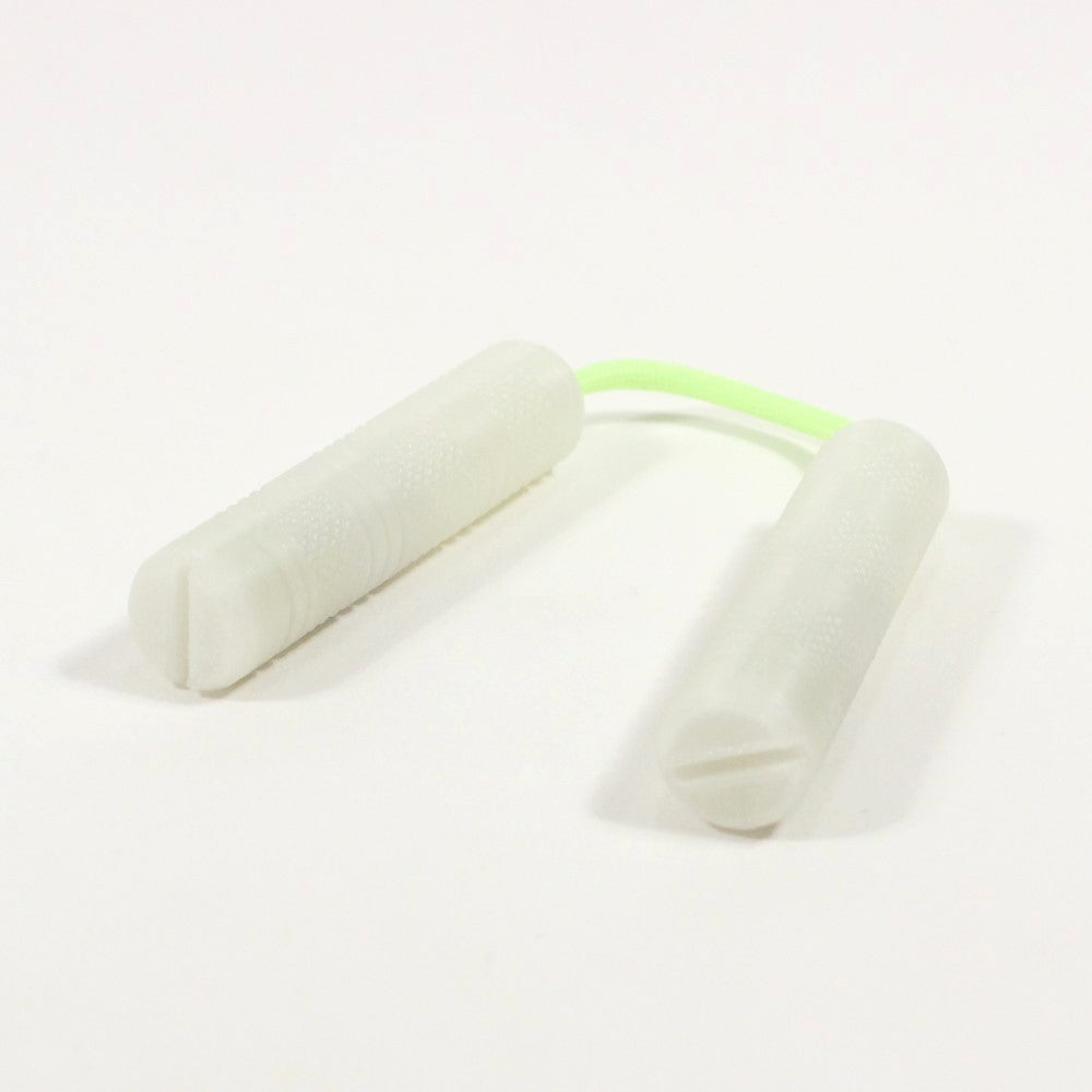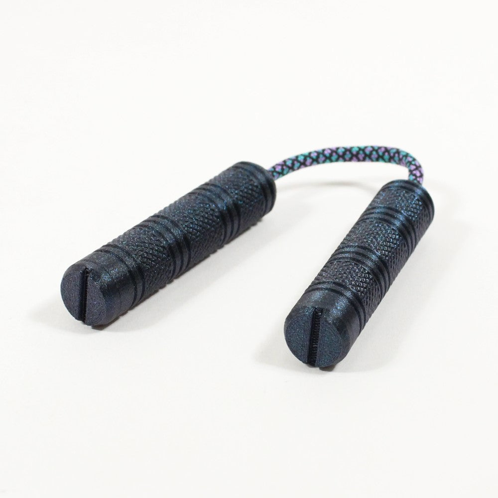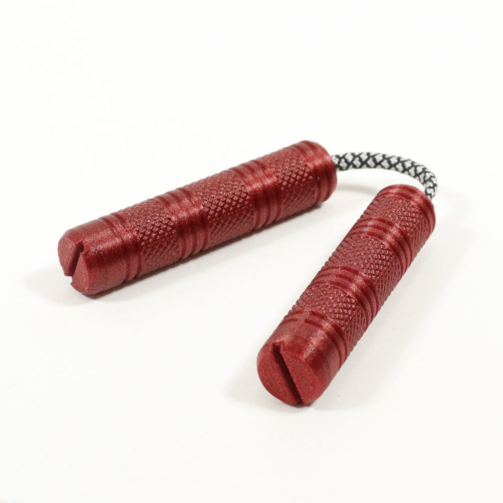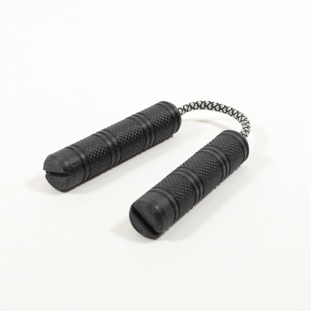 Each pair of Mini Chucks will ship assembled with 4 weights in each handle, screwed down to one 7" (180mm) length of 550 paracord. The rear caps of each handle are threaded to allow for removal and replacement of the weights and cord. A 1.5mm hex key is included for weight removal and adjustment.