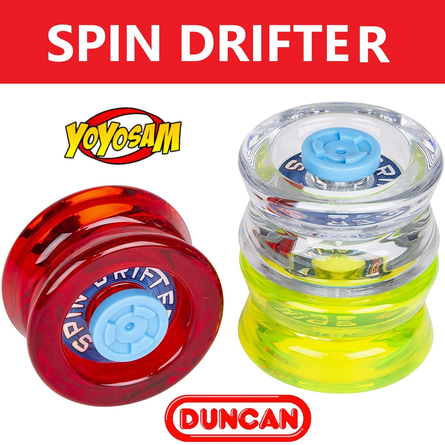 New ways to play! Duncan's Spin Drifter offers 3 play patterns in one new yo-yo design! Yo-yo, Top, Stack!. BEGINNER to ADVANCED: Duncan's Spin Drifter is equipped for standard play or use the side-spinners to allow the player to hold the yo-yo while spinning. Many new tricks! Invent your own!. Side Spinning Caps: Secured with small ball-bearings, each side of the yo-yo cap spins independently of the yo-yo. More play more tricks.. Stack and Spin: Much like fidget spinners, the Spin Drifter's sidecaps interlock to allow stacking while spinning. Simply remove the string and wind up like a gyroscope; then pull! How many can you stack while spinning?. LONG SPIN: The transaxle axle design allows for long spin times. For easy string changing, simply unscrew the sides..