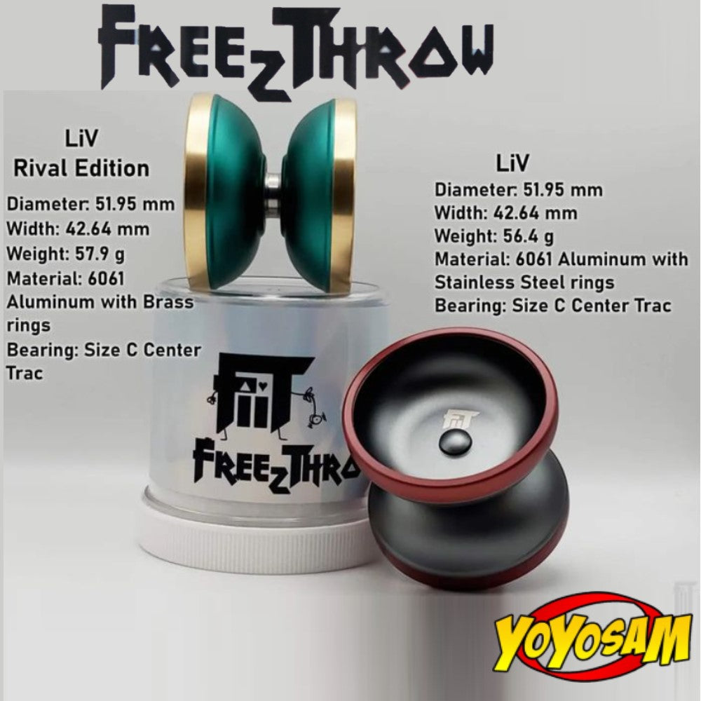 Free2Throw YoYos present their first release the "LiV". The LiV is a bi-metal yoyo made from 6061 Aluminum. The production colorway that is gunmetal grey with red stainless-steel rings, weighing only 56.4 g and the Rival Edition which is green with H59 Brass rings weighing 57.9 g.