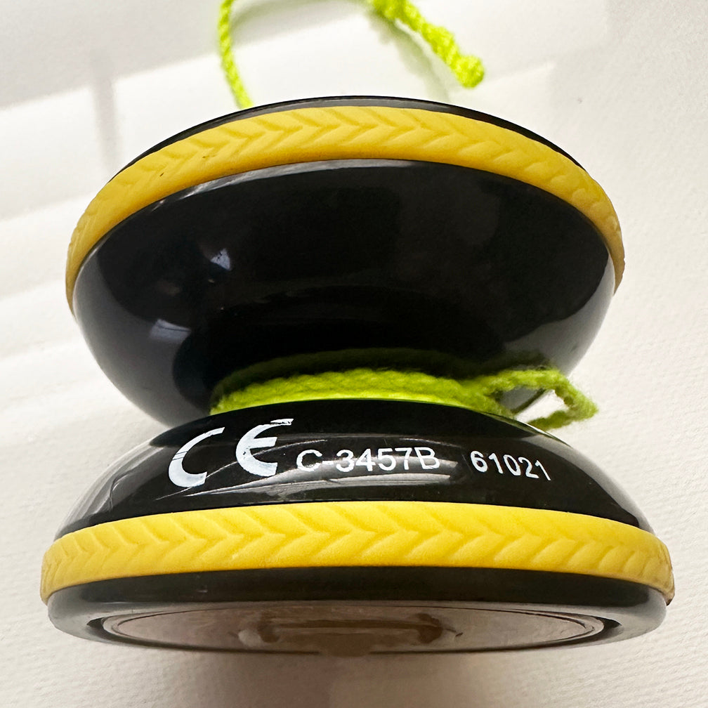 This Yo-Yo is branded Audley/Hasbro.   The whole side spins and it is really loud.  Probably part of a popular series that I'm not familiar with.  Could be a prototype given all the ID numbers on it.