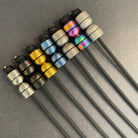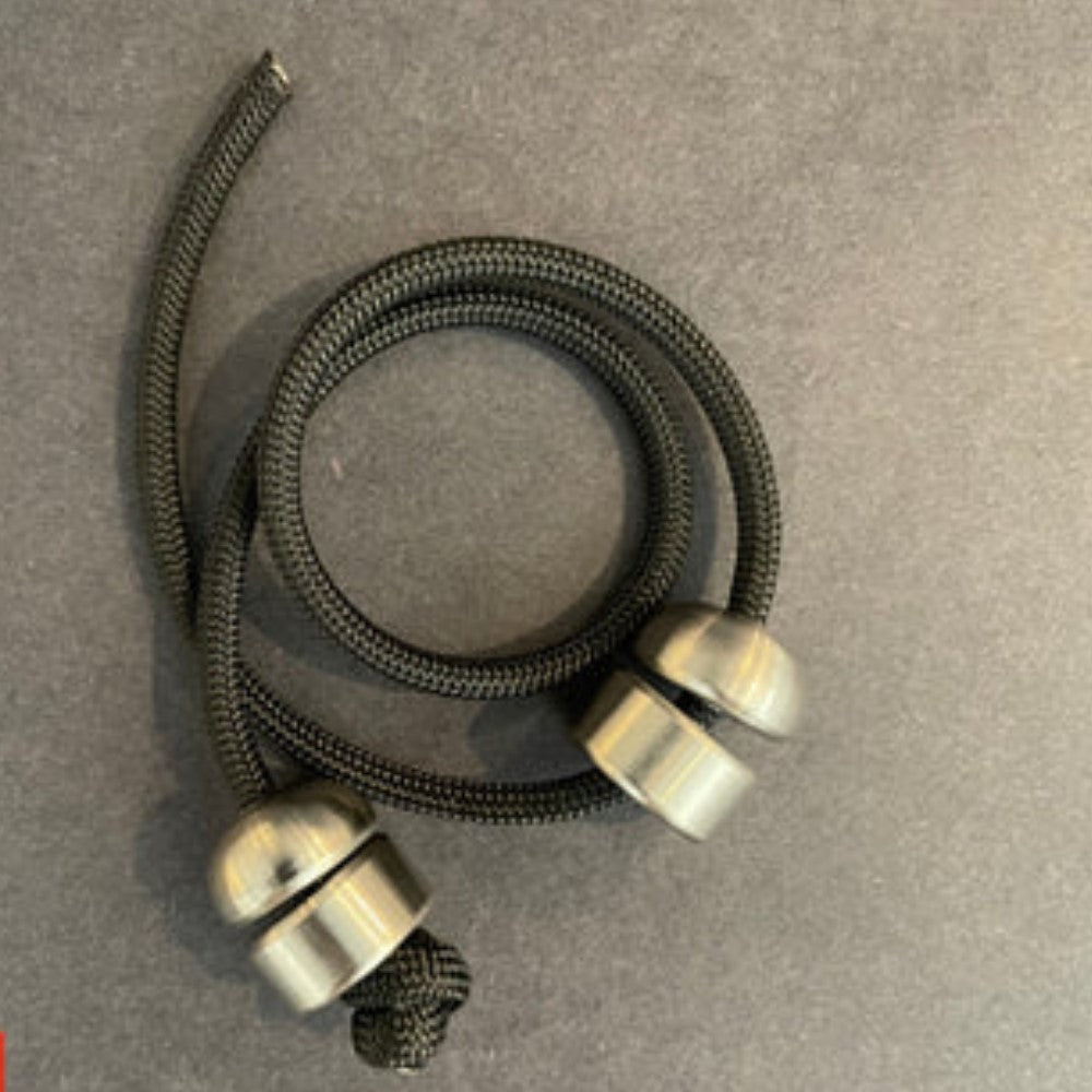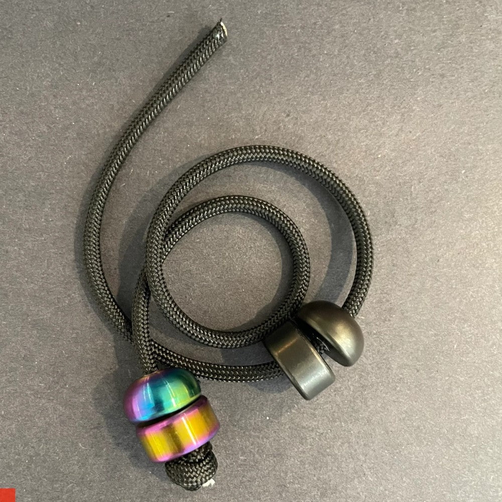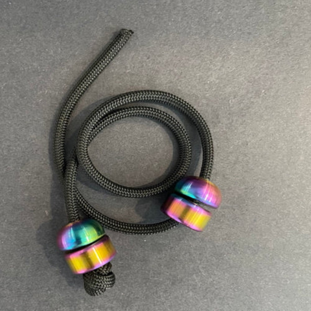 The Hybrid begleri design splices together some of the most distinctive and attractive features of two of our most popular begleri. The overall shape of the beads resembles that of the Titan begleri, with a cylindrical body and domed top. The bottom of the base bead is slightly recessed, which keeps the knot out of the way but not entirely hidden. Like our Hydra begleri, each end consists of separate beads, which add an additional fidget factor to the set. particularly welcome in situations where conspicuous slinging may not be appropriate.