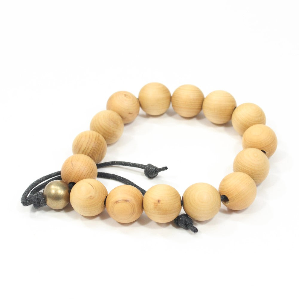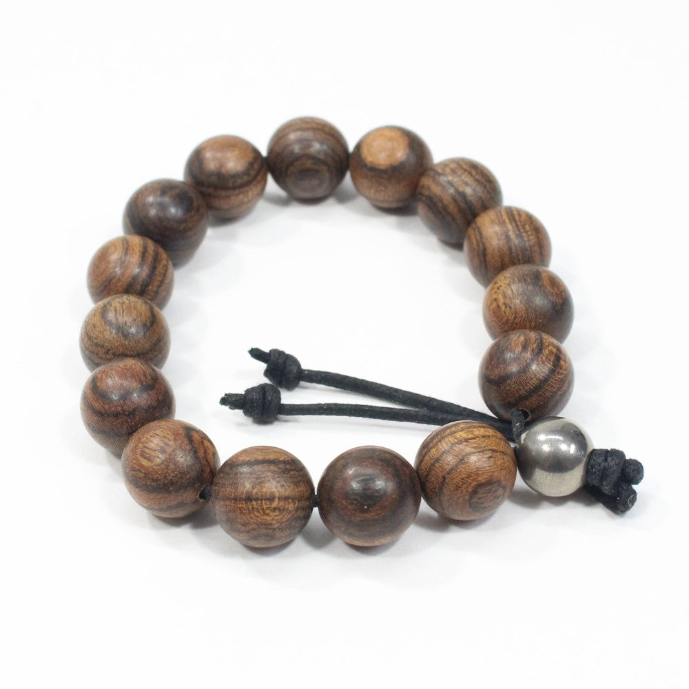 Each set consists of 15 wooden beads (15mm each) and a smaller head bead. The adjustable closure is provided by a sliding knot, which can be tightened as needed. They are available in five varieties: