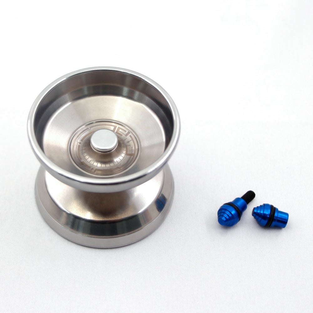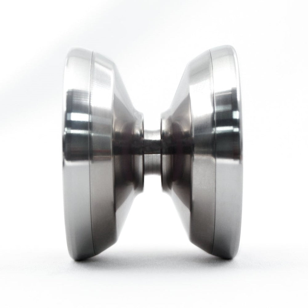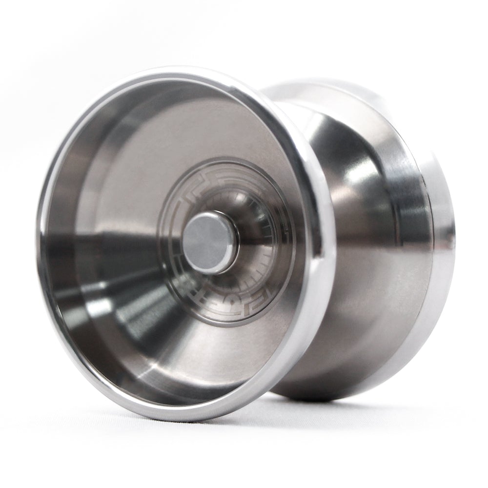 Given that Droid is to be a SE yo-yo, it is critical to have an outer ring design instead of an inner ring. The titanium yo-yo body of Droid (without the outer rings) measures at a smaller and hence safer 54 mm, allowing the yo-yo to be machined more consistently. The outer rings makesup the rest of the 57 mm diameter for Droid. Given Droid's bimetal design, it has significantly more rim weight and torque.