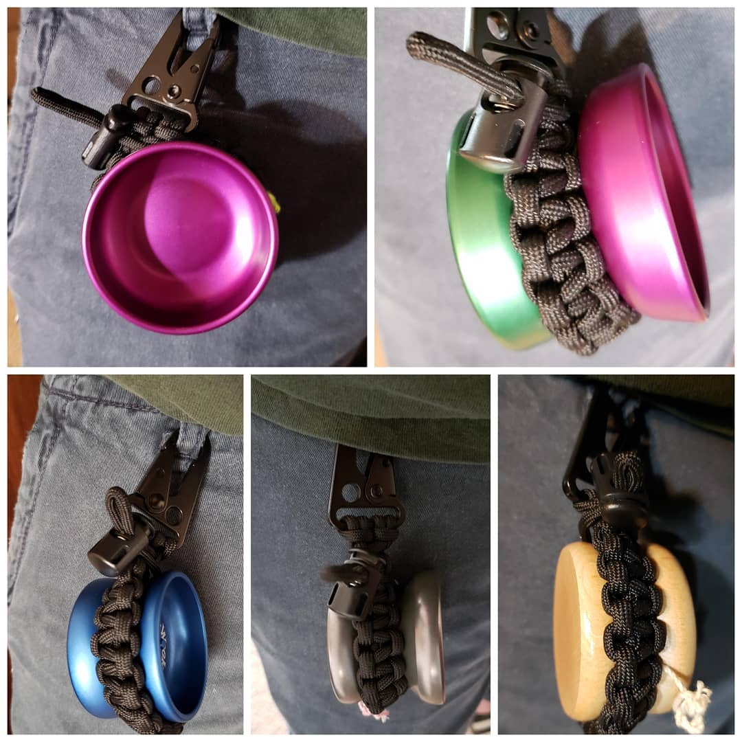We feel that this goes above and beyond for any yoyo holder. Easily the most versatile design yet, it can safely, silently and securely carry all sizes of yoyos from oversized to micro, slim lines, fixies, offstring, 3A sets, 5A set ups, even diabolos aren't too large! No more swinging yoyos to ding. No more cheap carabiners. No more surprise ball taps. These slings ride close to your body, high and tight with no swing! The Clip has so many configurations that it give you options of how you want to carry based on your needs for that day. One hand retrieval of your edc? Got it. Super secure deisgn that keeps the clip away from the yoyo? No problem. Silent carry of hard counterweights and yoyo? We got ya. 3A players, daisy chain 2 Clips together and carry your set easily! Fixies? Yup. Loonie? Yep. Burm? Yes!