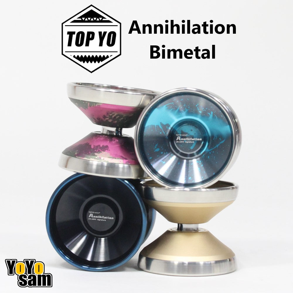 TOP YO Annihilation Bimetal Yo-Yo is the bimetal version of the highly popular Annihilation monometal. It comes with a 7068 AL body and stainless steel rims. A Lin Junyi Signature YoYo.