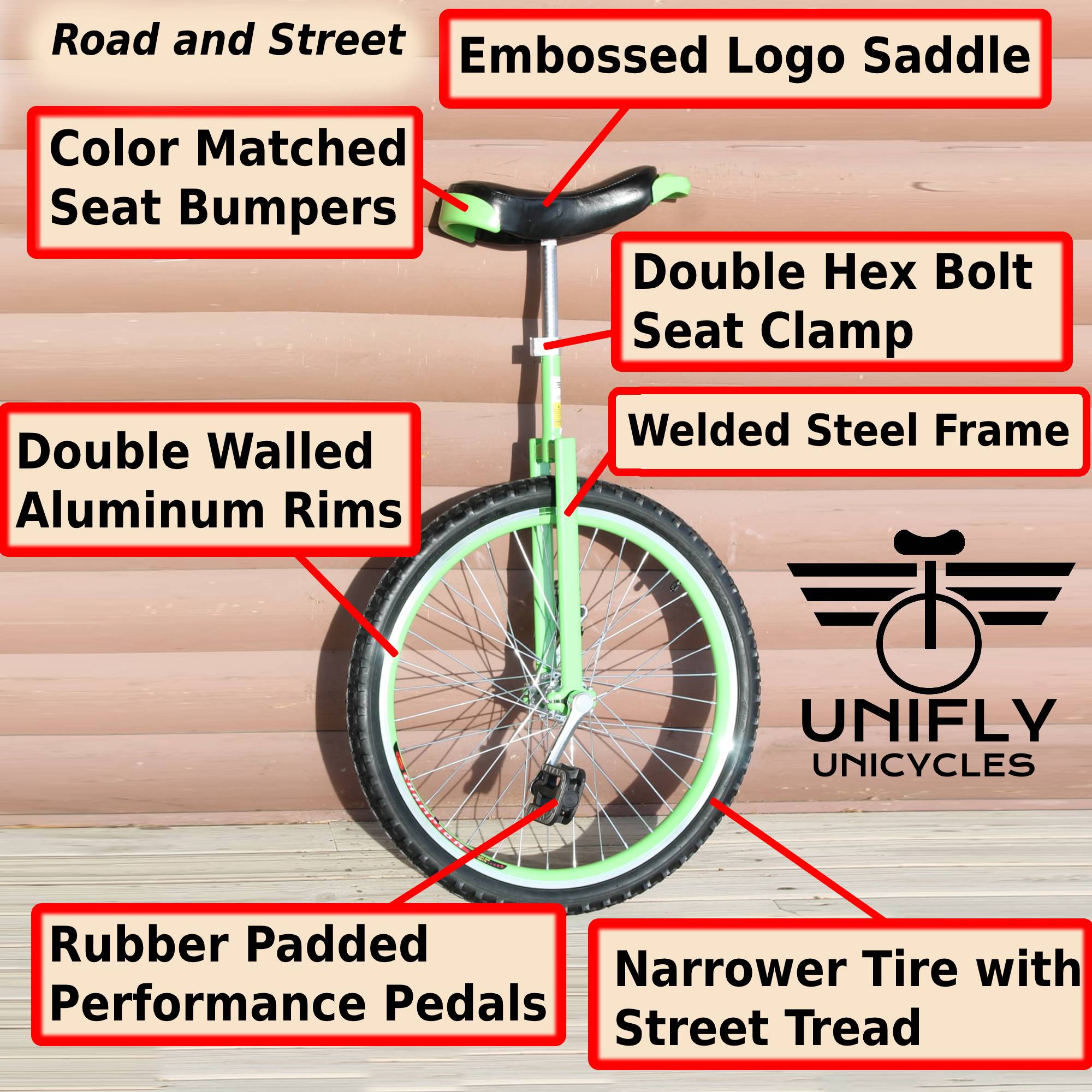 The Unifly Road Unicycle is a great option for streets, sidewalks, parking lots, or just getting around town. Extra strong frame made of oval steel tubing. A narrower wheel, 1.9" for better speeds, and a reinforced double walled aluminum rim with color matched sides. Pedals have a no slip rubber grip pad for extra traction. A great choice for all levels or riding. Easy to assemble, it comes with all the tools needed.