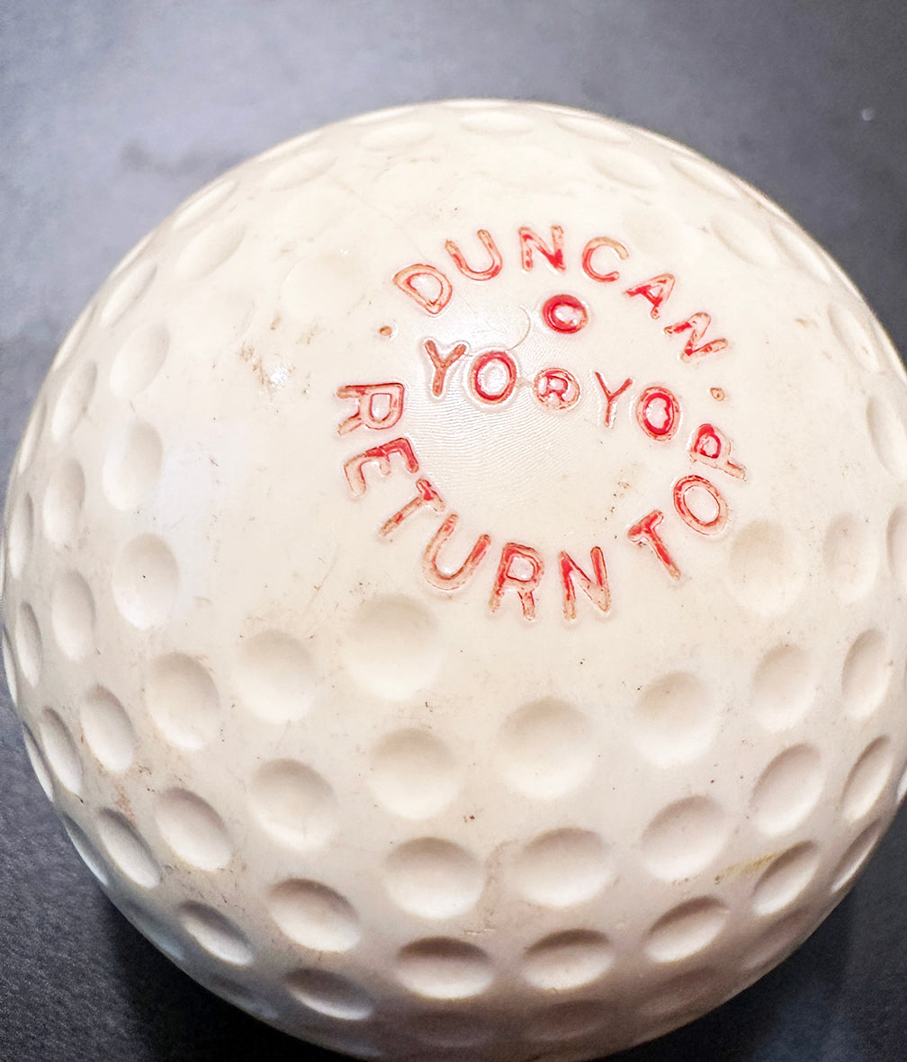 This is a rare and interesting golf ball yo-yo. From the Duncan portsline of the early 1960s. It is in good condition and all the red stamp is readable with no visible chips or scratches. Would probably clean up nice.