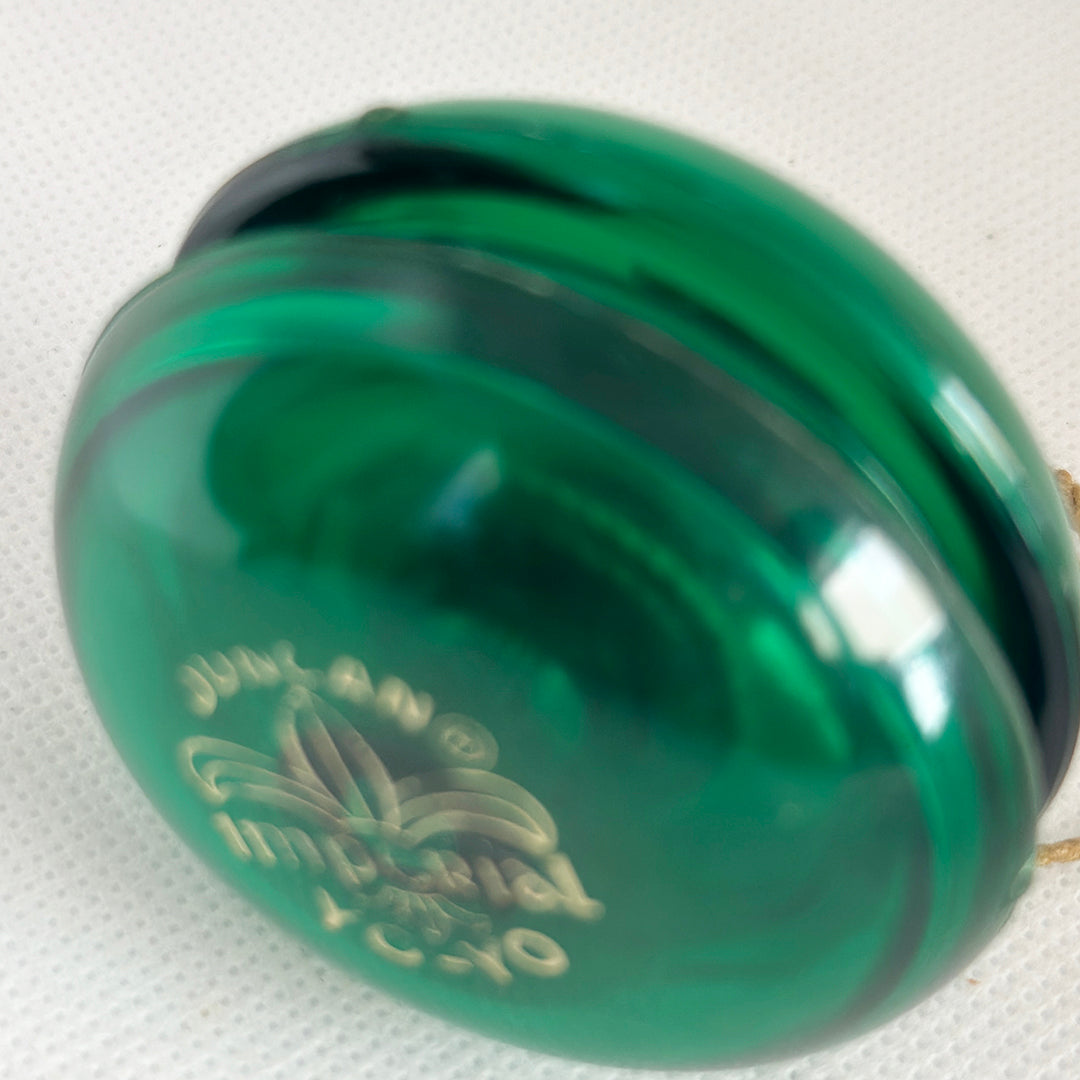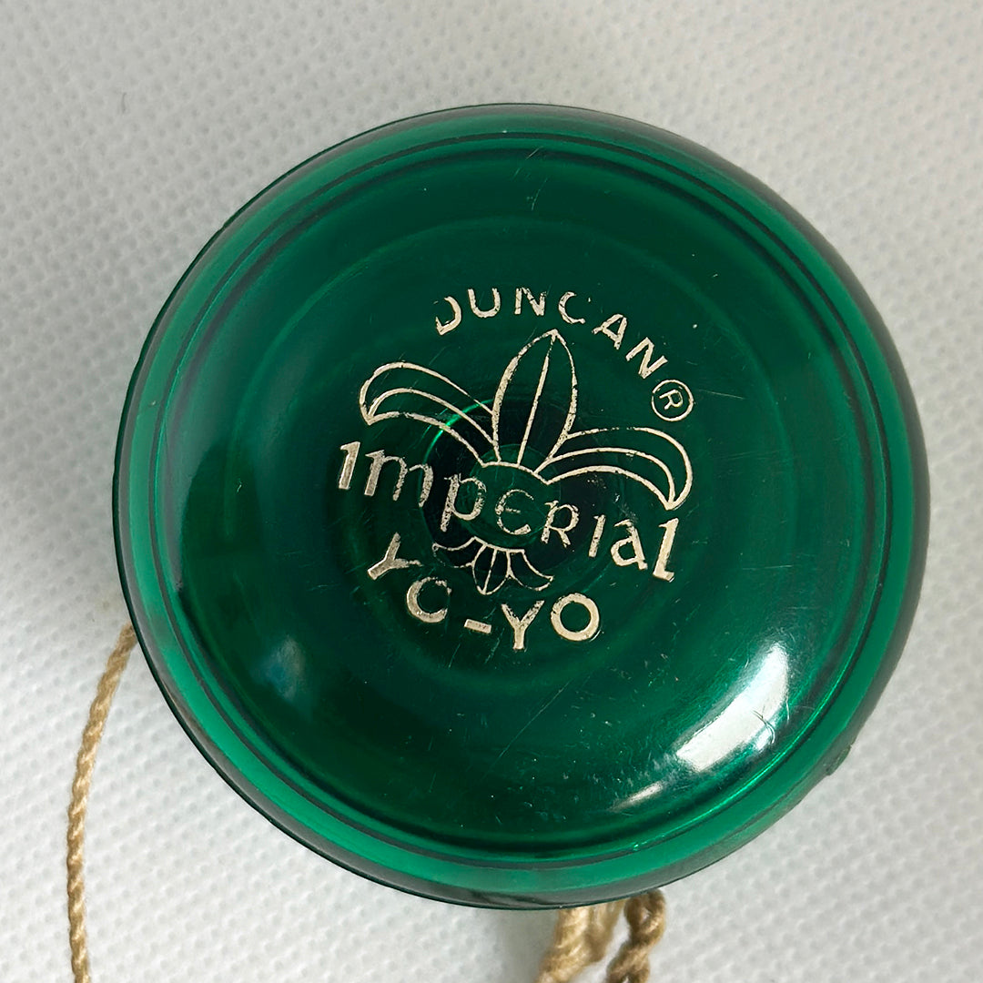 Vintage Duncan Yo-Yo - Fluer-de-lis Imperial Transluscent Emerald Green. There is no rocker on the bottom below the stamp, such as Made in USA, or World's #1. And the rre Emerald Green color shows us this was made in the 70s. But it was made in USA.