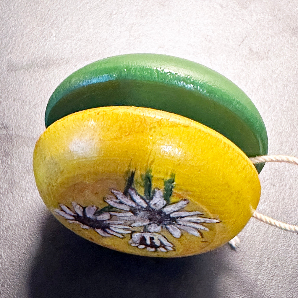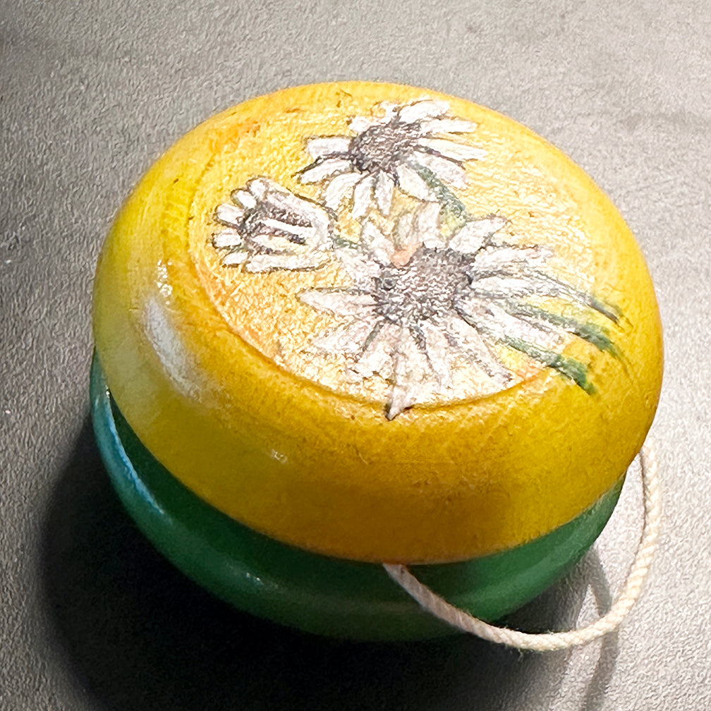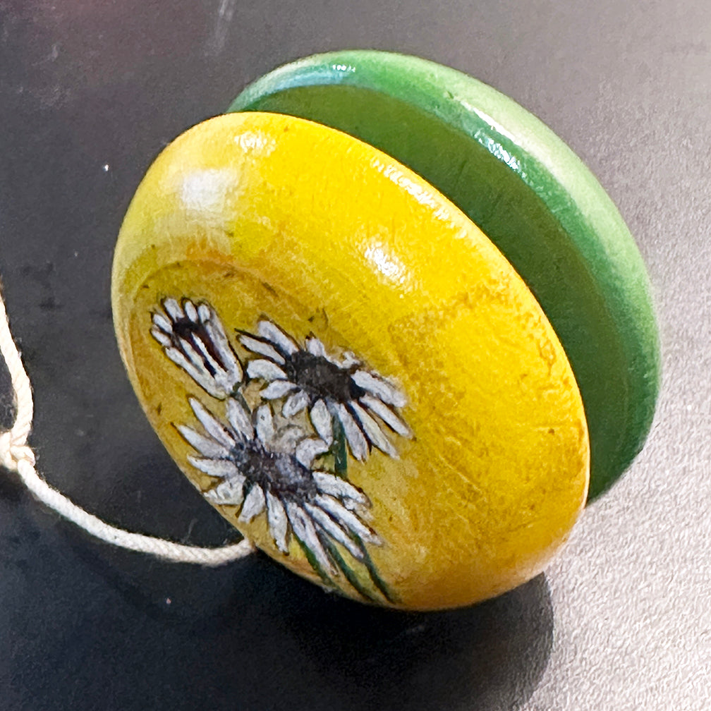 No doubt there is a story behind this yo-yo. It was clearly painted with love and patience. Did Ann like it? Did she hate it? Did she even want a hand painted yo-yo? Had she always dreamed of a hand painted yo-yo? Why Daisies? Did the artist love daisies? Did she or he not know how to paint petunias? This little yo-yo leaves us wondering. we can only hope it brought some joy to Ann once upon a time.