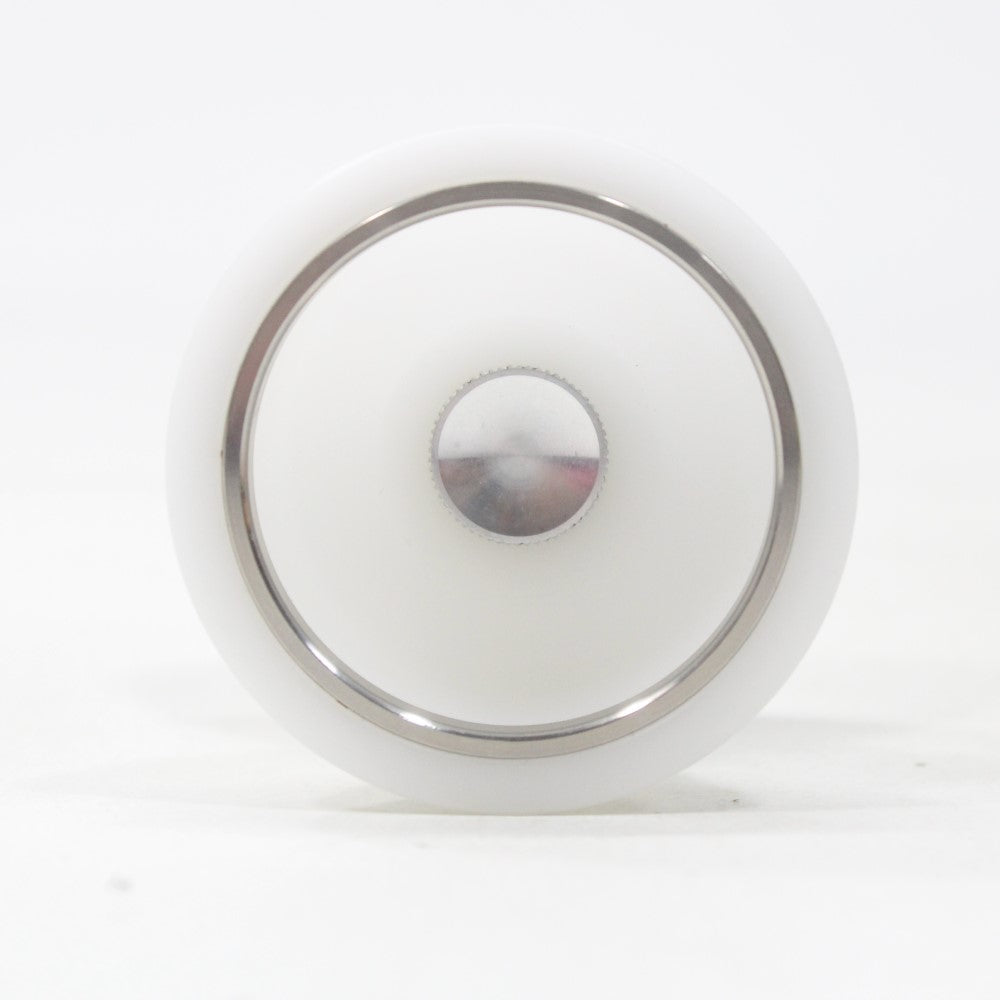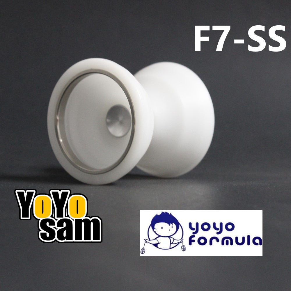 Yoyoformula takes the F7 into the bimaterial realm with the F7ss! Inner rings of stainless steel in the cup help provide the extra momentum to push this ultra wide POM bodied yoyo to the next level! Over 55mm in width to make even the most risky catches just a bit easier! POM plastic is known for its durabilty and is a great material to achieve high precision machined yoyos that rival aluminum yoyos in many ways - coupled with the stainless steel inner ring design, you get the best of both worlds with bimaterial design!